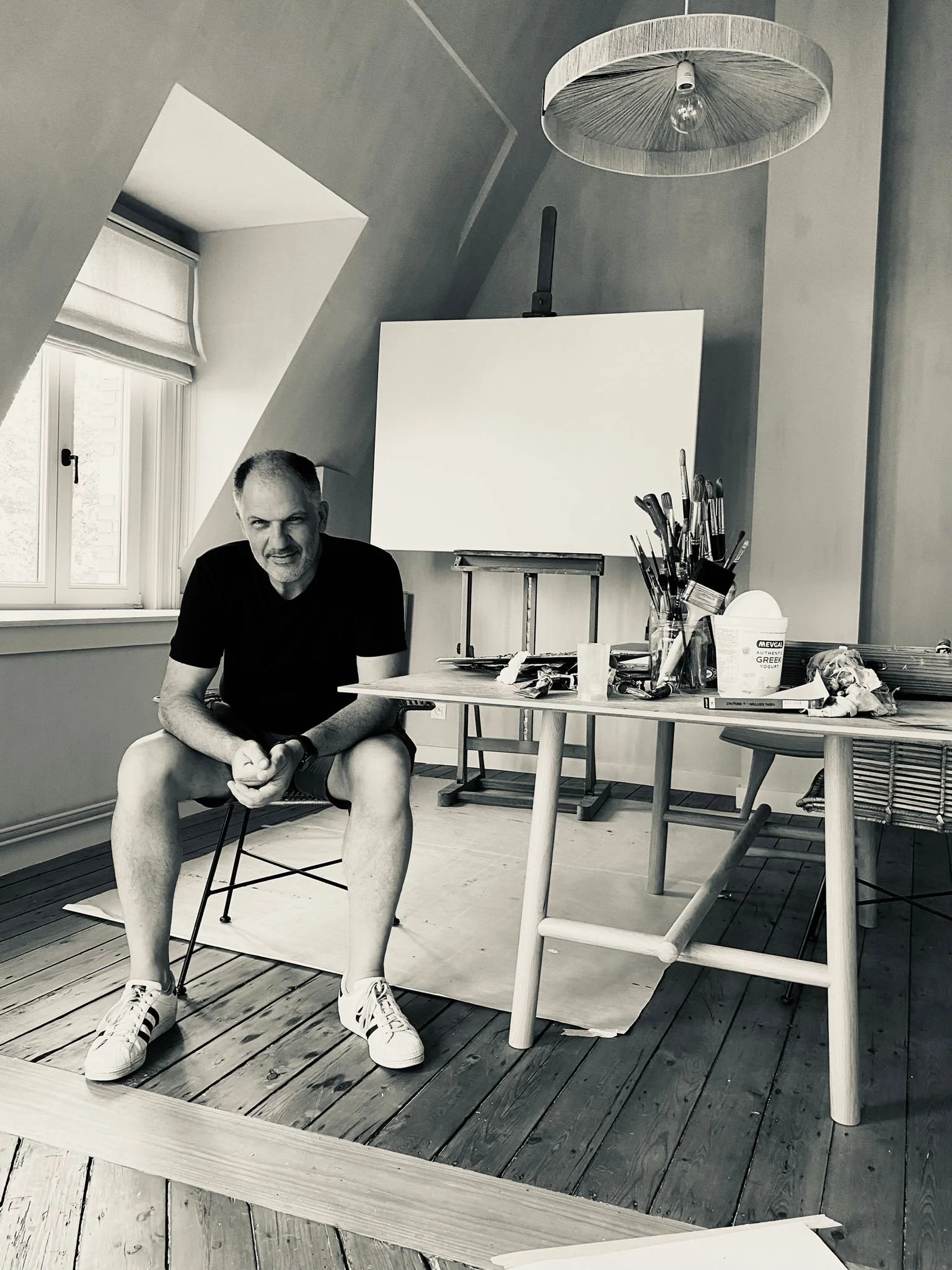 His inspiration arises spontaneously from the inner personal observation of life. The abstract-surreal paintings have a vulnerable undertone. The works are rarely without emotion.